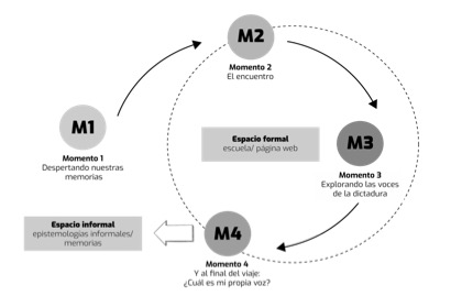 El modelo didáctico se desarrolla en cuatro momentos (ver figura 1): Despertando Nuestras Memorias; El Encuentro; Explorando las voces de la dictadura; y al final del viaje, ¿cuál es mi propia voz? Estos últimos se estructuran a partir de dos elementos centrales: