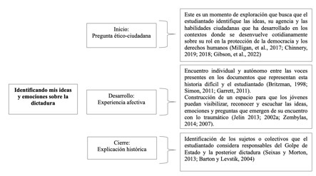 Considerando que las complejidades mencionadas también se desarrollan con otras historias difíciles a nivel mundial (Barton y McCully, 2012; Goldberg, 2020; Zembylas, 2014) y que existen escasos lineamientos didácticos pilotados en aula y reflexionados con el profesorado en ejercicio que permitan abordar esta situación, el presente artículo tiene como objetivo proponer un modelo didáctico para el trabajo de la dictadura civil militar chilena desde una perspectiva ético-ciudadana. Con esta finalidad, en una primera instancia, se caracterizan los conceptos que estructuran la propuesta, tales como historias difíciles, experiencias afectivas, documentos de memoria y derechos humanos y la dimensión ética del pensamiento histórico. Posteriormente, se presenta cómo fue elaborado el trayecto didáctico y se describen los cuatro momentos que lo componen. Por último, se describirán sus potencialidades y desafíos para su uso en las aulas.